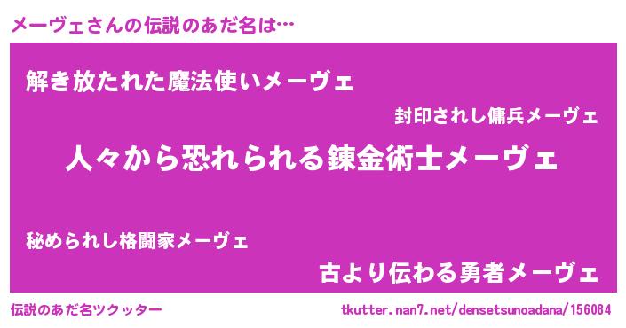 | ヒーロー風カッコイイあだ名 | 『友情の使者メーヴェ』『銀牙騎士メー』 |