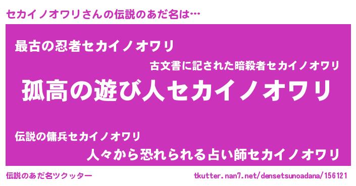 | ポケモン風あだ名 | 『セカセウス』『ヒセカイノオワリ』 |