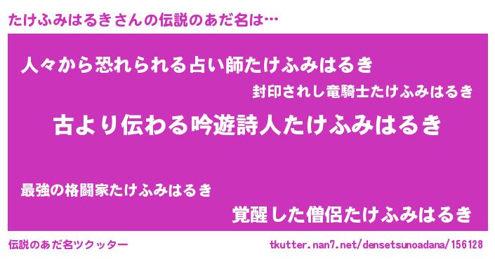 | 女子向けラノベタイトル風あだ名 | 『たけふみはるきの契約王妃』 |