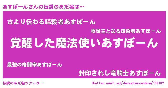 | 男性向けラノベタイトル風あだ名 | 『あすぼーん~年齢イコール彼女いない歴の魔法使い~』 |
