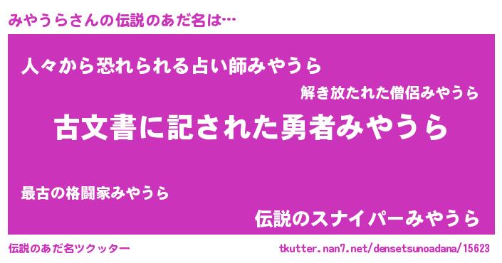 | 意味不明あだ名 | 『住所不定無職みやうら(95歳)』 |