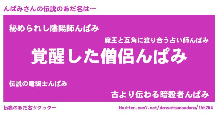 | 男性向けラノベタイトル風あだ名 | 『んぱみの嫁は女の子じゃないと思った?』 |