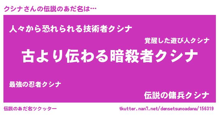 | 男性向けラノベタイトル風あだ名 | 『クシナに滅ぼされるだけの簡単なお仕事です』 |