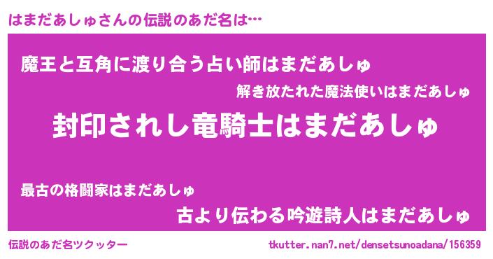 | 男性向けラノベタイトル風あだ名 | 『はまだあしゅ~年齢イコール彼女いない歴の魔法使い~』 |