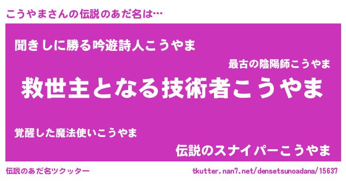 | 男性向けラノベタイトル風あだ名 | 『こうやま~年齢イコール彼女いない歴の魔法使い~』 |