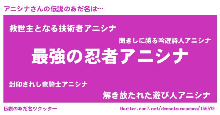 | 男性向けラノベタイトル風あだ名 | 『アニシナに滅ぼされるだけの簡単なお仕事です』 |