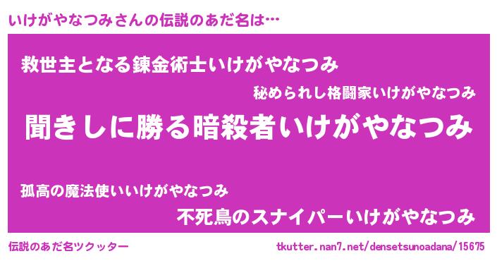 | 男性向けラノベタイトル風あだ名 | 『いけがやなつみという概念が存在しない退屈な世界 』 |