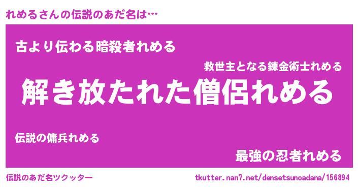 | 女子向けラノベタイトル風あだ名 | 『れめるの卵を拾いまして』 |