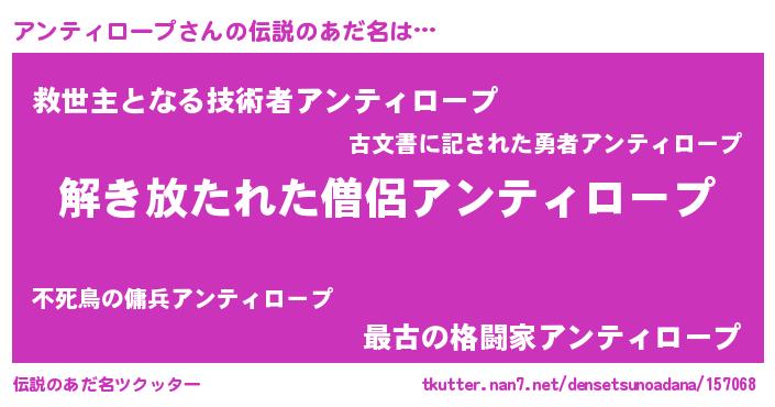 | 意味不明あだ名 | 『自称アンティロープ』 |