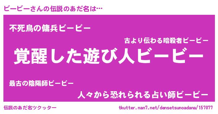 | 男性向けラノベタイトル風あだ名 | 『ビービーに滅ぼされるだけの簡単なお仕事です』 |