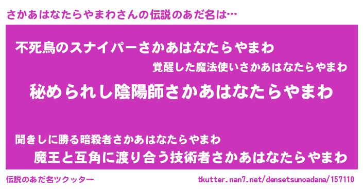 | 男性向けラノベタイトル風あだ名 | 『魔弾の王とさかあはなたらやまわ』 |