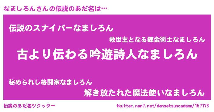 | 意味不明あだ名 | 『永久保存なましろん』『自称なましろん』 |