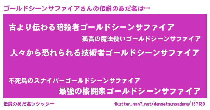 | 男性向けラノベタイトル風あだ名 | 『おまえをオタクにしてやるから、俺をゴールドシーンサファイアにしてくれ! 』 |