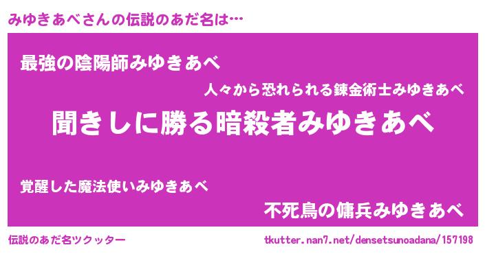 | 男性向けラノベタイトル風あだ名 | 『みゆきあべという概念が存在しない退屈な世界 』 |