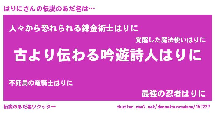 | 女子向けラノベタイトル風あだ名 | 『はりにの契約王妃』『死神はりにの再婚』 |