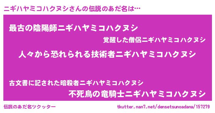 | 男性向けラノベタイトル風あだ名 | 『魔弾の王とニギハヤミコハクヌシ』 |
