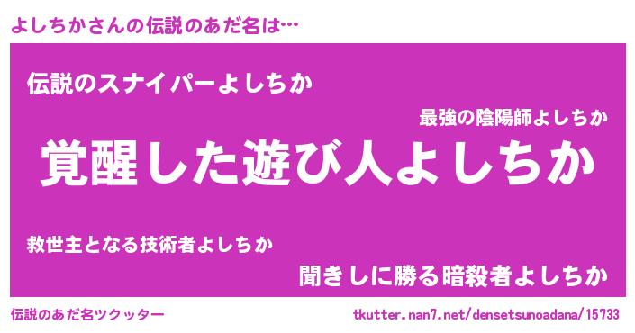 | 男性向けラノベタイトル風あだ名 | 『よしちかの嫁は女の子じゃないと思った?』 |