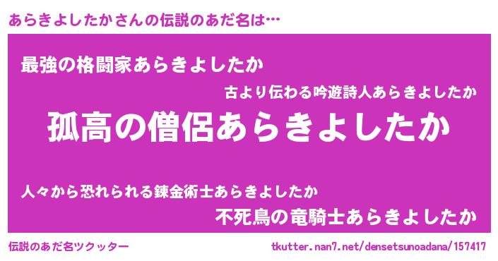 | 男性向けラノベタイトル風あだ名 | 『アラキヨシタカスレイヤー』 |