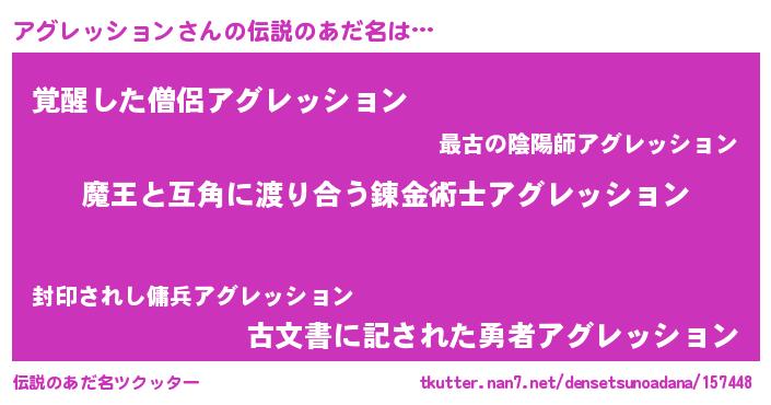 | ヘコむあだ名 | 『アグぷりん』『アグレッション(遠い目)』 |