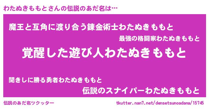 | ヒーロー風カッコイイあだ名 | 『幻影騎士ワタ』『ネオワタヌキモモト』 |