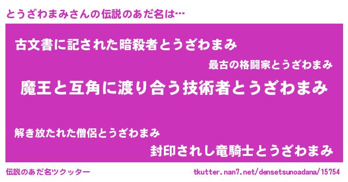 | ヘコむあだ名 | 『とうざわまみ(小並感)』『とうもー』 |