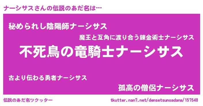 | 女子向けラノベタイトル風あだ名 | 『ナーシサス姫と円卓の騎士』 |