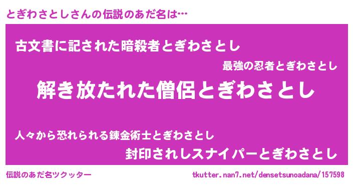 | ヒーロー風カッコイイあだ名 | 『魔戒騎士トギ』『究極戦士トギワサトシ』 |