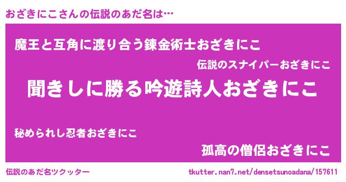 | 男性向けラノベタイトル風あだ名 | 『オザキニコスレイヤー』 |