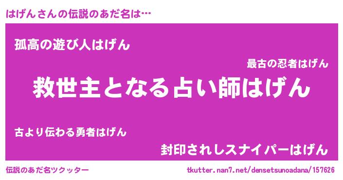 | ヒーロー風カッコイイあだ名 | 『天空の使者はげん』『暗黒騎士ハゲ』 |