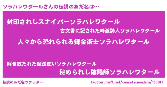 | 男性向けラノベタイトル風あだ名 | 『おまえをオタクにしてやるから、俺をソラハレワタールにしてくれ! 』 |
