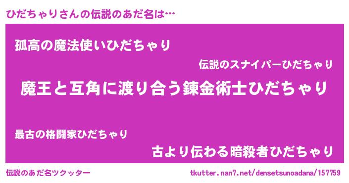 | 女子向けラノベタイトル風あだ名 | 『ひだちゃり恋絵巻』『闇のひだちゃり』 |