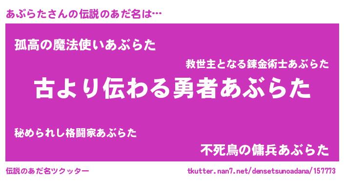 | 胡散臭い通販商品みたいなあだ名 | 『来世でも幸せになれる水素水…その名も「あぶらた」』 |