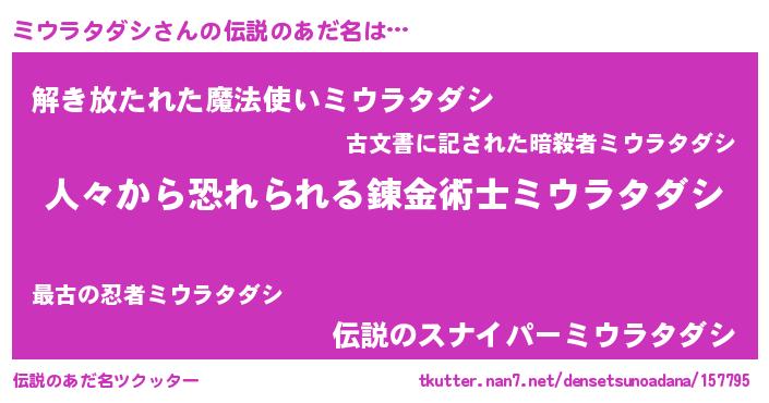 | 男性向けラノベタイトル風あだ名 | 『おまえをオタクにしてやるから、俺をミウラタダシにしてくれ! 』 |