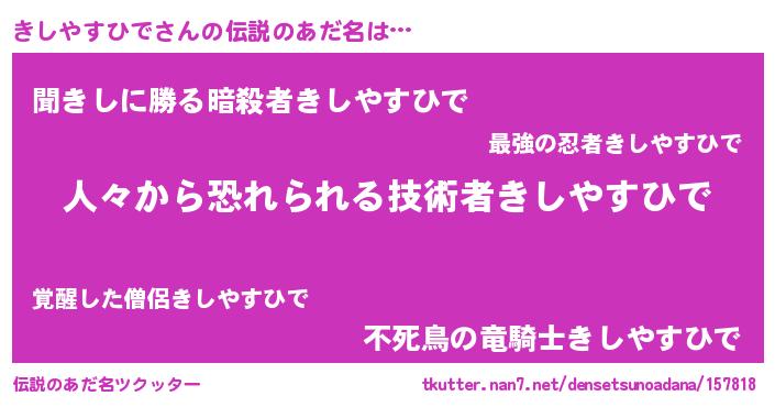 | 男性向けラノベタイトル風あだ名 | 『おまえをオタクにしてやるから、俺をきしやすひでにしてくれ! 』 |