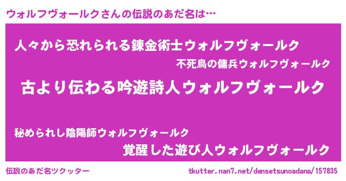 | 男性向けラノベタイトル風あだ名 | 『転生したらウォルフヴォールクだった件』 |