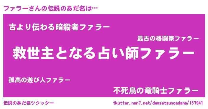 | 男性向けラノベタイトル風あだ名 | 『ファラー~年齢イコール彼女いない歴の魔法使い~』 |