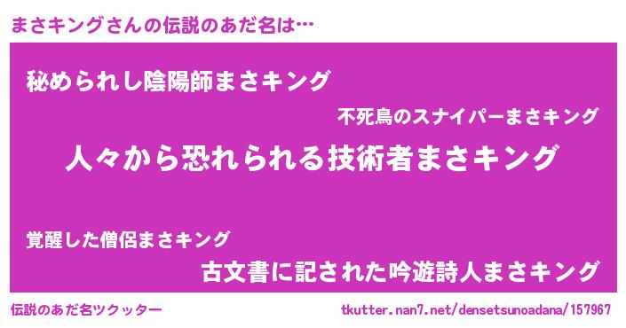| 男性向けラノベタイトル風あだ名 | 『おまえをオタクにしてやるから、俺をまさキングにしてくれ! 』 |