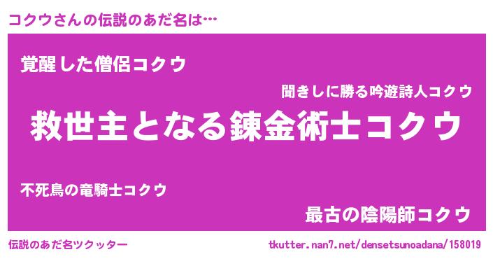 | ヒーロー風カッコイイあだ名 | 『慈愛の使者コクウ』『炎刃騎士コク』 |