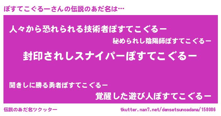 | 男性向けラノベタイトル風あだ名 | 『Re:ぽすてこぐるーから始める異世界生活』 |
