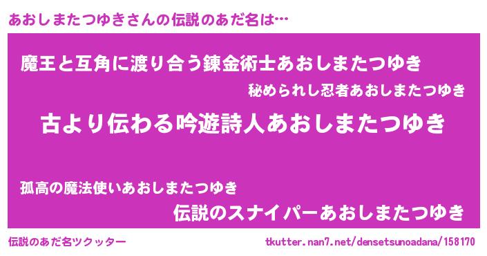 | 男性向けラノベタイトル風あだ名 | 『転生したらあおしまたつゆきだった件』 |