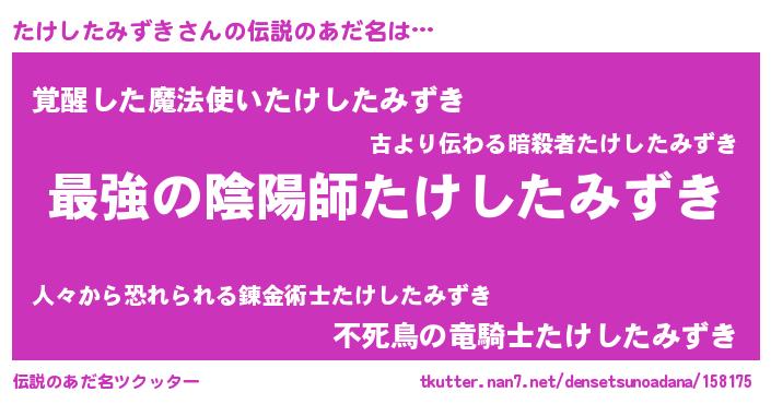 | 男性向けラノベタイトル風あだ名 | 『Re:たけしたみずきから始める異世界生活』 |