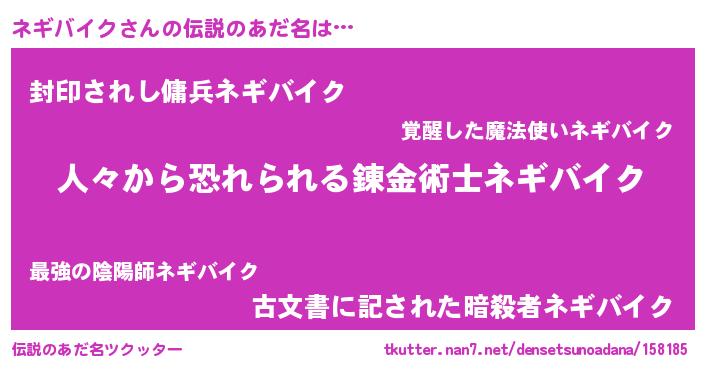 | 男性向けラノベタイトル風あだ名 | 『おまえをオタクにしてやるから、俺をネギバイクにしてくれ! 』 |