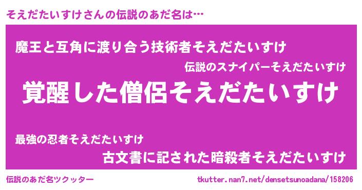| 男性向けラノベタイトル風あだ名 | 『そえだたいすけの嫁は女の子じゃないと思った?』 |