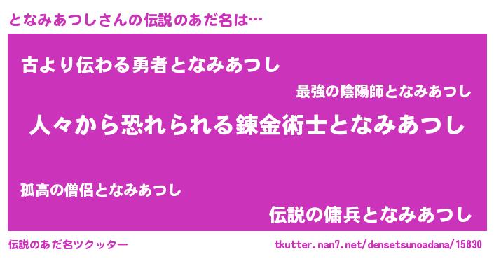 | 男性向けラノベタイトル風あだ名 | 『トナミアツシスレイヤー』 |