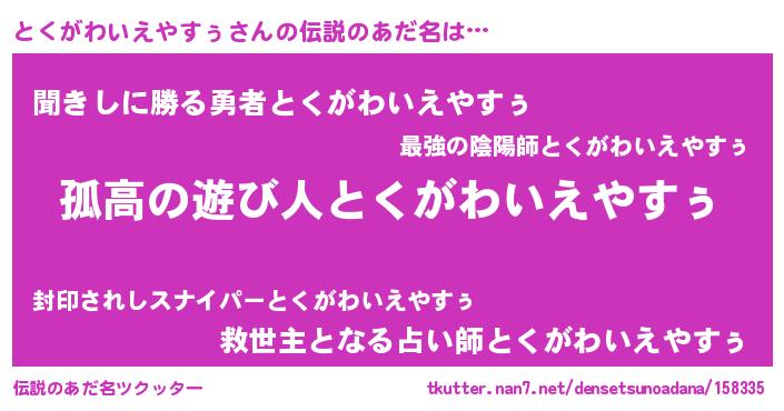 | 男性向けラノベタイトル風あだ名 | 『トクガワイエヤスゥスレイヤー』 |