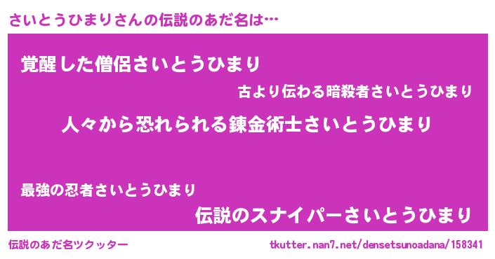 | ポケモン風あだ名 | 『サックウザ』『ヒサイトウヒマリ』 |