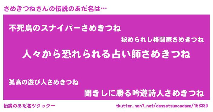 | 男性向けラノベタイトル風あだ名 | 『おまえをオタクにしてやるから、俺をさめきつねにしてくれ! 』 |