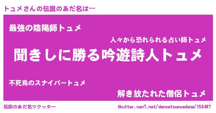 | 意味不明あだ名 | 『住所不定無職トュメ(5歳)』『自称トュメ』 |