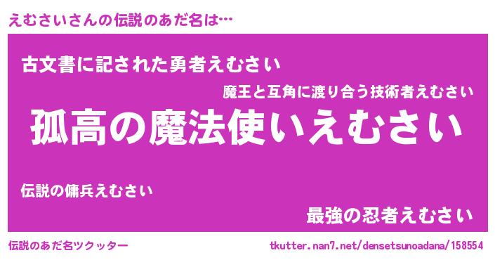 | 意味不明あだ名 | 『住所不定無職えむさい(12歳)』 |