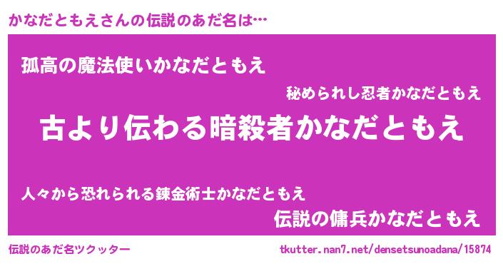 | 胡散臭い通販商品みたいなあだ名 | 『来世でも幸せになれる健康食品…その名も「かなだともえ」』 |